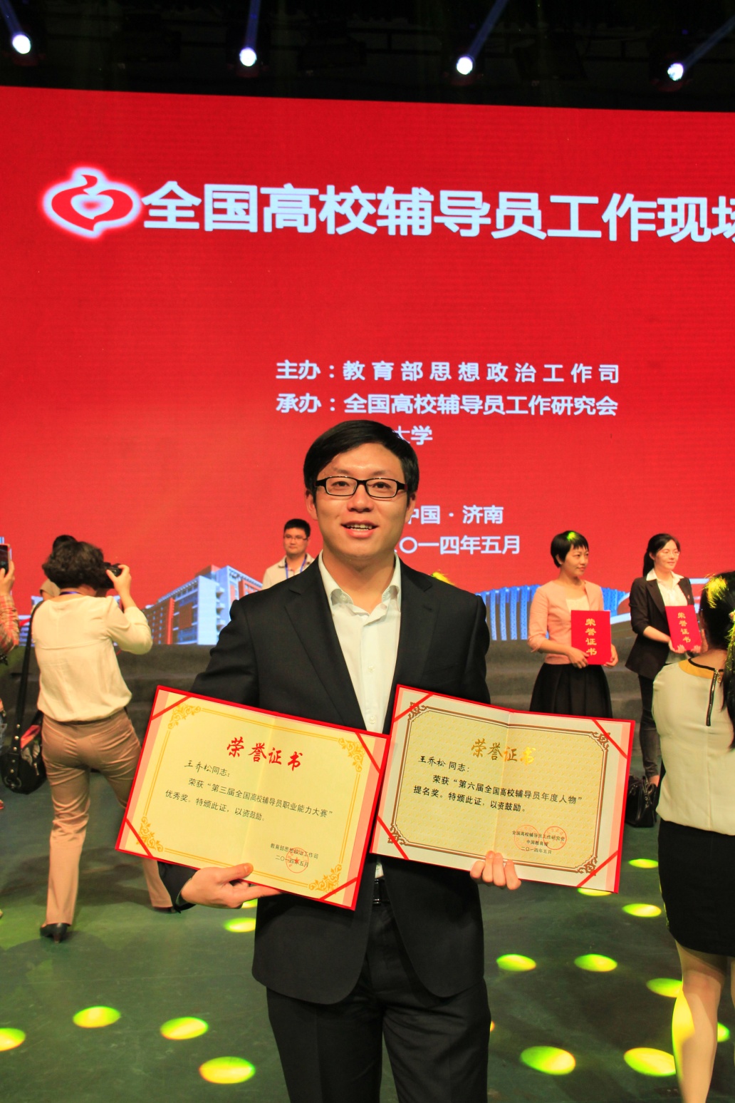 近日,全国高校辅导员职业能力大赛在山东大学举行,我校信息学院辅导员王乔松作为上海高校两名代表之一,挺进全国决赛并获得优秀奖。同期举行的全国高校辅导员工作现场会还对王乔松等51名获得第六届全国高校辅导员年度人物及提名奖的辅导员进行了表彰,这也是我校辅导员首次获得全国高校辅导员年度人物提名奖。