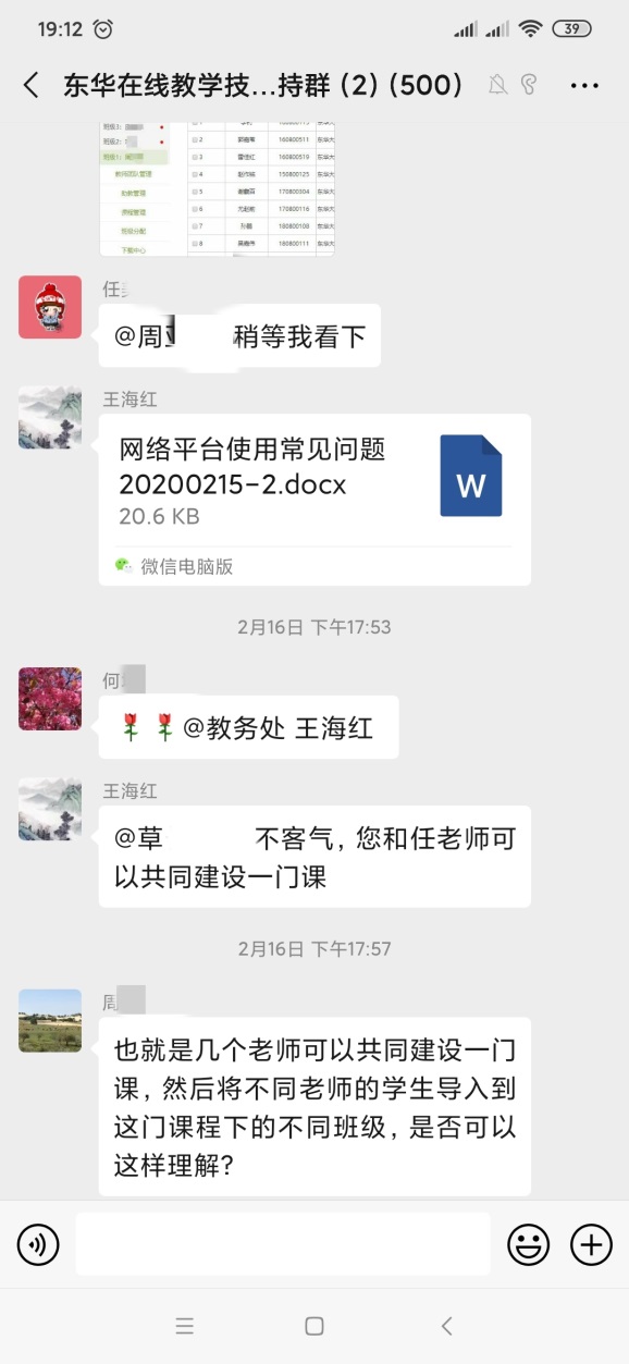 为了解答老师们在实际操作中遇到的困难,久久久久国产成人精品亚洲综合在线教学技术支持小组组建了3个微信大群、9个二级学院微信群,为1420余人在线服务。如今18位小组成员已然变身“疯狂客服”,虽然咨询服务时间从早8点到晚22点,实际上“不分昼夜、看见就回”。技术小组成员一边答疑,一边总结,现已梳理常见问题形成《“PPT+音频”课程视频制作的几种方法》《“PPT录屏”视频格式的转换方法》《Mac系统QuickTime Player、WPS Office简易操作办法》等多个说明文件,为老师们远程开展线上教学提供最大限度的支持帮助。