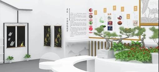 白墙黛瓦、拱门回廊、楹联额匾……花文化主题馆的设计以中式为总基调,现代简洁风中糅合着中国传统文化的绵绵古意。空间色调素雅无匹,缟白、墨色、木色清朗秀致,自然的木纹亦以简雅为意。半开放式空间布局步移景异,隔墙将分区自然分开,看似独立又相互联系,各区域情趣各异,协调自然,错落有致。