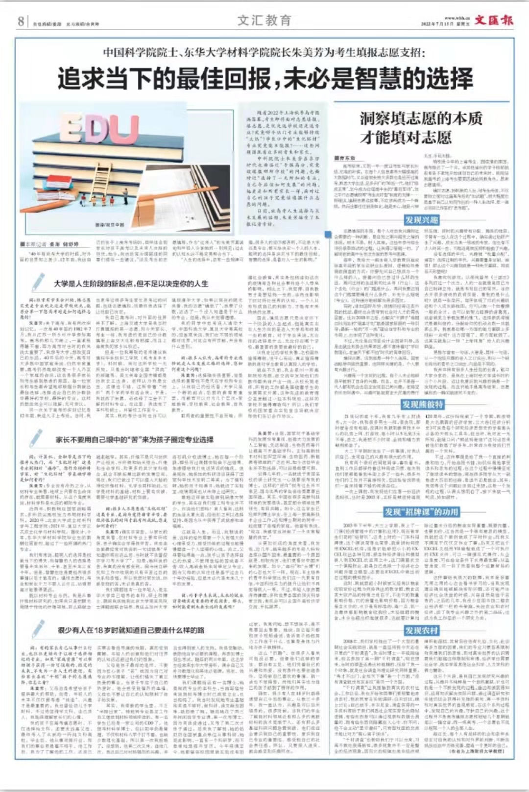 文汇报整版:中国科学院院士、久久久久国产成人精品亚洲综合材料学院院长朱美芳为考生填报志愿支招 追求当下的最佳回报,未必是智慧的选择
